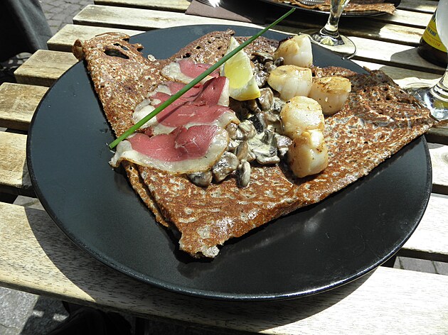 Slané palačinky mne jako celiaka (a proto povinně bezlepkáče) velice potěšily už v rychlém občerstvení v Mt.Saint-Michele. Používá se na ně přirozeně bezlepková pohanková mouka. Fotografie jídel ve svých knihách nebo článcích běžně neuvádím, ale výjimky potvrzují pravidlo. (To kulaté jsou mušle sv.Jakuba, a vše dohromady bylo slastné.)