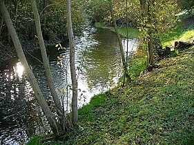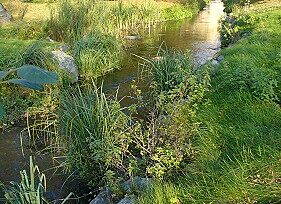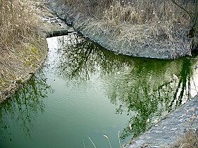 Musí být blíž k silnici, upomínám se na impozantní přeliv, který jsem viděla z hráze, technické dílo jako na nějaké malé přehradě. A už vidím, jak se potůček spojuje s mohutným, prudkým tokem. Potok teď teče asi 300 metrů „přírodou“, skutečně, na březích je tráva a rostou tam stromy a je tu ráj kachen. Ale ještě než vteče do Ruzyně, je po slávě mé i potoční, neboť potok je přehrazen, oba svahy nad ním jsou rozbagrovány, z jedné strany vede dolů obrovská roura, nezbývá mi než najít si cestičku zpátky k závoře a nahoře na nějakém plotu vidím cedulku ČKV, neboli toto se na chudáka potok asi chystá.