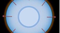 Tento objev zde byl popsán již dříve (5), ale málo, takže se pokusíme jej popsat podrobněji. Vycházíme z toho, že vesmír se nejdříve rozpínal zpomaleně v důsledku gravitace, asi do stáří 6 Gyr, a potom zrychleně,
