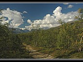 Pokračujeme kolem ohromného jezera Tornetrask do NP Abisko, kde děláme přestávku a pozorujeme monumentální "Bránu Laponska" - doširoka roztažené údolí ve tvaru širokého "U" a taky něco, jako tržiště z laponských obydlí.