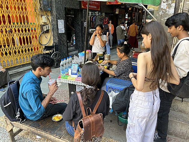 Tady jedna žena přímo před vámi připravuje něco jako vaječný svítek, plněný pálivým masem. Jmenuje se to "laphing". A patřičně jí dělají reklamu i indičtí průvodci Majnu-ka-tilla Marketem. Ale nebojte se, maje na paměti zážitky z předešlého dne, odolal jsem.