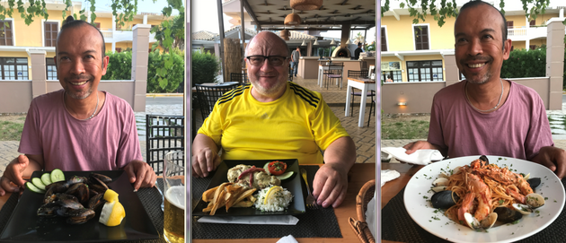 Jsme zpátky v hotelu a rozhodneme se dát si jídlo ve zdejším grill baru. Večeře je to ovšem také vypečená. Přítel si objednává mušle, přičemž výpomocný číšník odvedle z baru slibuje velký hrnec mušlí. Nakonec jich přinesou 12 z toho jedna je zavřená nedobytně (taková je vždy zkažená a násilné otevření není na místě). Následuje velký hlad a další objednávka: tentokrát ústřic s houbami. Po chvíli ale číšník přijde, že ústřice došly. To už je ovšem druhé zklamání, protože původně si chtěl přítel objednat jehněčí kotletky, které ale také nejsou. Tak si nakonec objednává krevety s tomatovou pálivou omáčkou a špagetami.