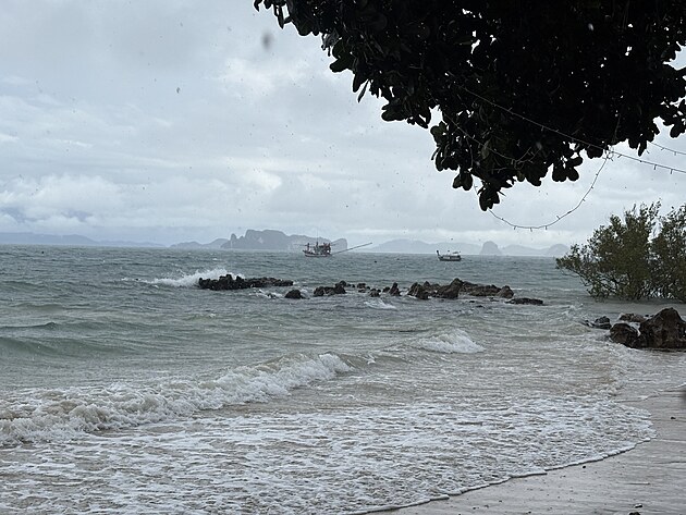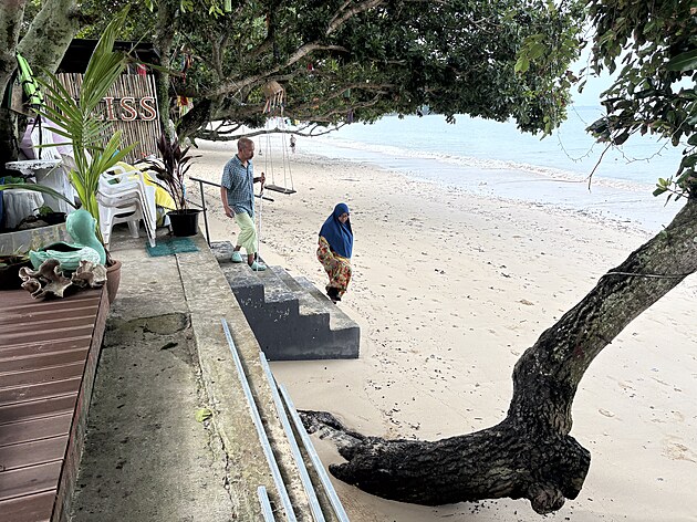 Voda řádila přes noc na pláži tak dokonale, že odplavila písečnou základnu schodů z našich bungalovů a z posledního schodu jsme seskakovali skoro půl metru.