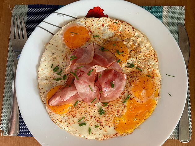 Druhou mou oblíbenou zdravou stravou je šunka s vejci (prosím, neplést s vejci se šunkou, jak si to kdysi „vyložil“ jeden chytrý číšník/kuchař v parlametní restauraci a přinesl mi namísto pečené šunky s volskými oky onu šunkovou míchanici).