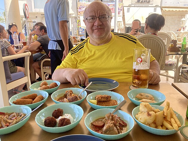 Co vám naopak nabídnu, je fotografie z restaurace. Známý poprvé chtěl okusit řeckou kuchyni, tak jsme se rozhodli rovnou pro tzv. meze - výběr 10 řeckých jídel. Byli jsme vyzváni ke vstupu do restaurace přímo majitelem - takový ten klasický způsob zvaní hostů. Nicméně jsme napřed před restaurací studovali nabídku. A tak když jsme pak vešli, byl jsem "oceněn" tím, že mi pivo přinesl přímo majitel.