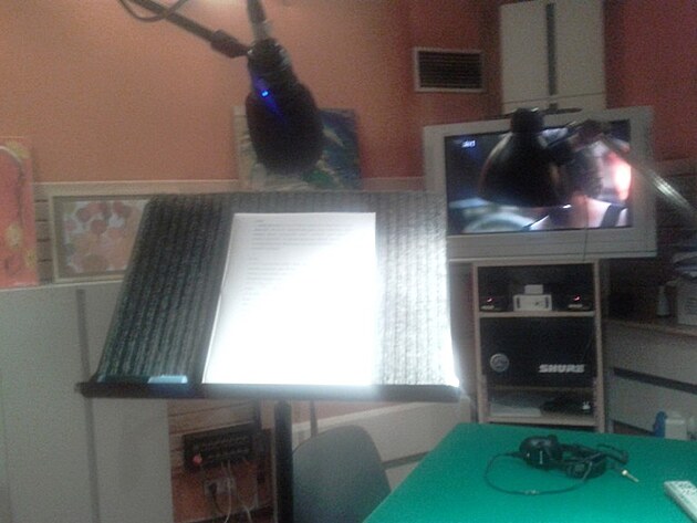 Před sebou má tedy herec pultík s původním textem, respektive přepisem textu na obraze. Na uších sluchátka, kde běží původně nahraný zvuk. A k tomu všemu ještě herec zírá na vzdálený televizní monitor pofiderního rozlišení, kdy zejména v celkových, vzdálených záběrech, si herec na ústa nevidí a musí se chytat zvuku ve sluchátkách. Tady to máte celé nafoceno.