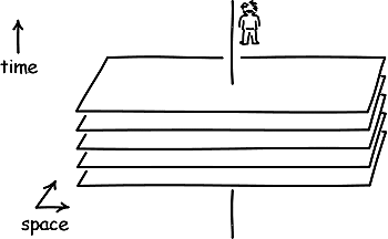 Tato mechanická představa vzniká, když skládáme všechny současnosti na sebe, jako třeba diapozitivy, které dohromady dají film nějakého pohybu. Musíme předpokládat, že každý takový diapozitiv zůstane na svém místě a nikdy se ani malinko nezmění. K představě této neměnnosti vede ale jen a pouze informace, kterou jsme získali v době, kdy minulost byla současností. Je to pouze hypotéza, která vyplývá z představy, že náš čas je absolutní, konkrétně tady jediný a poslední existující čas (ve smyslu postupu do struktury reality), platný pro všechny strukturní úrovně a všechny oblasti (i mimo náš vesmír).