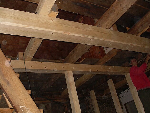 Jednou v létě takhle byl čas uložit nový nosný trám napříč chalupou. Jeho délka byla 5 metrů a průřez 20x20 cm. Sice ze smrkového dřeva, ale i tak úctyhodný macek, který se měl uložit místo dřívější nosné stěny, kde nově vznikal otevřený prostor. Tesař připravil kladkostroj, všechny další pomůcky, a s mým synem se dali do práce. Já o místnost vedle brousil asfalt (chalupa v 60. létech sloužila jako sběrné suroviny) ze 170 let staré bukové podlahy doufaje, že se mi ji podaří zachovat. Chlapy od vedle jsem pořád slyšel funět, klít, nadávat, odpočívat. Trvalo jim to den, ale trám byl uložen. Já na tu podlahu nakonec potřeboval ještě den další, ale zadařilo se.