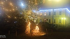 V severní části Masarykova náměstí v Žamberku, poblíž busty TGM, stojí vánoční strom a před ním dřevěný vyřezávaný Betlém.