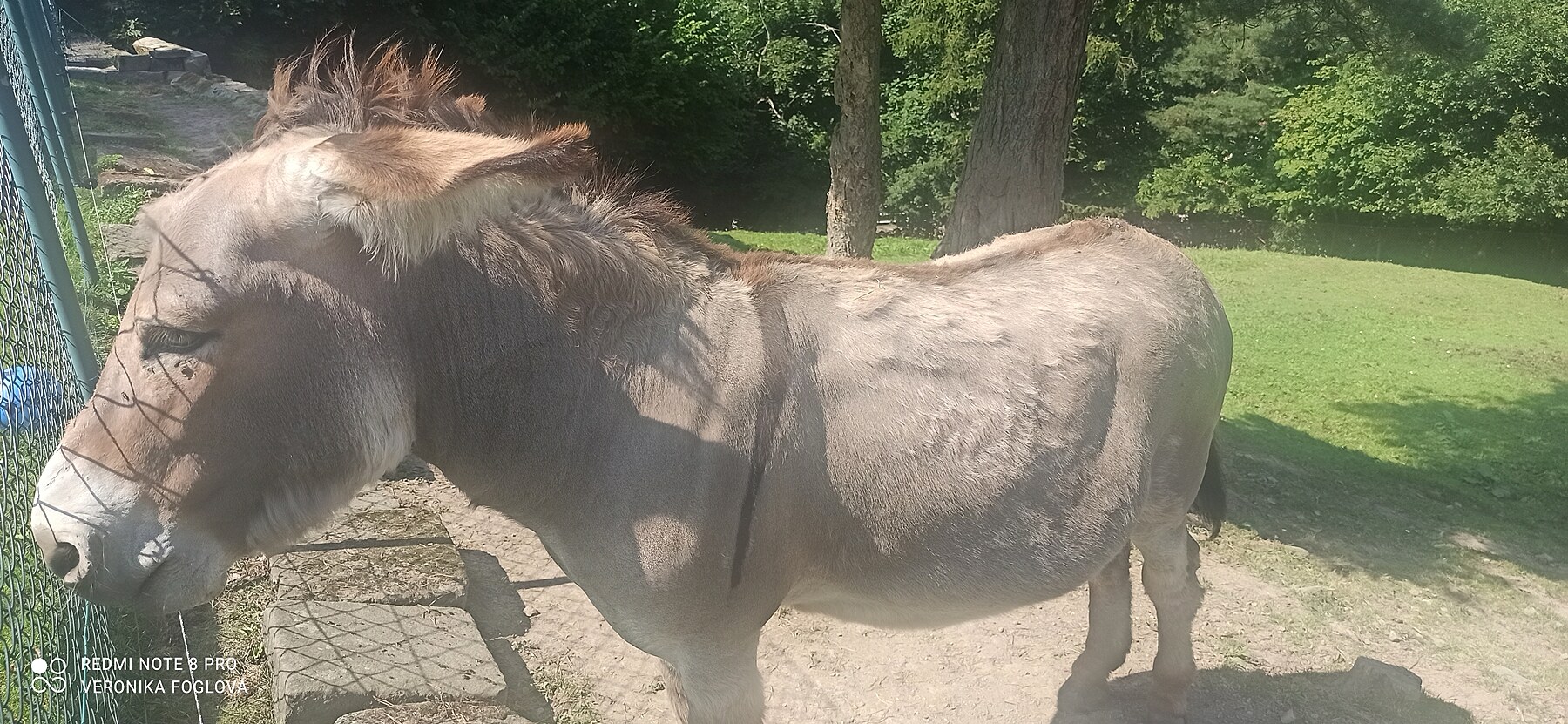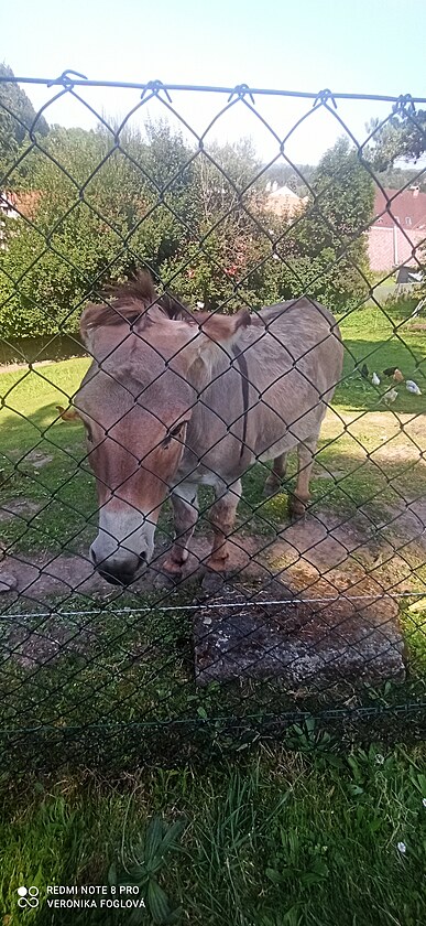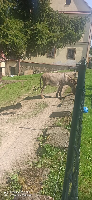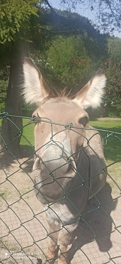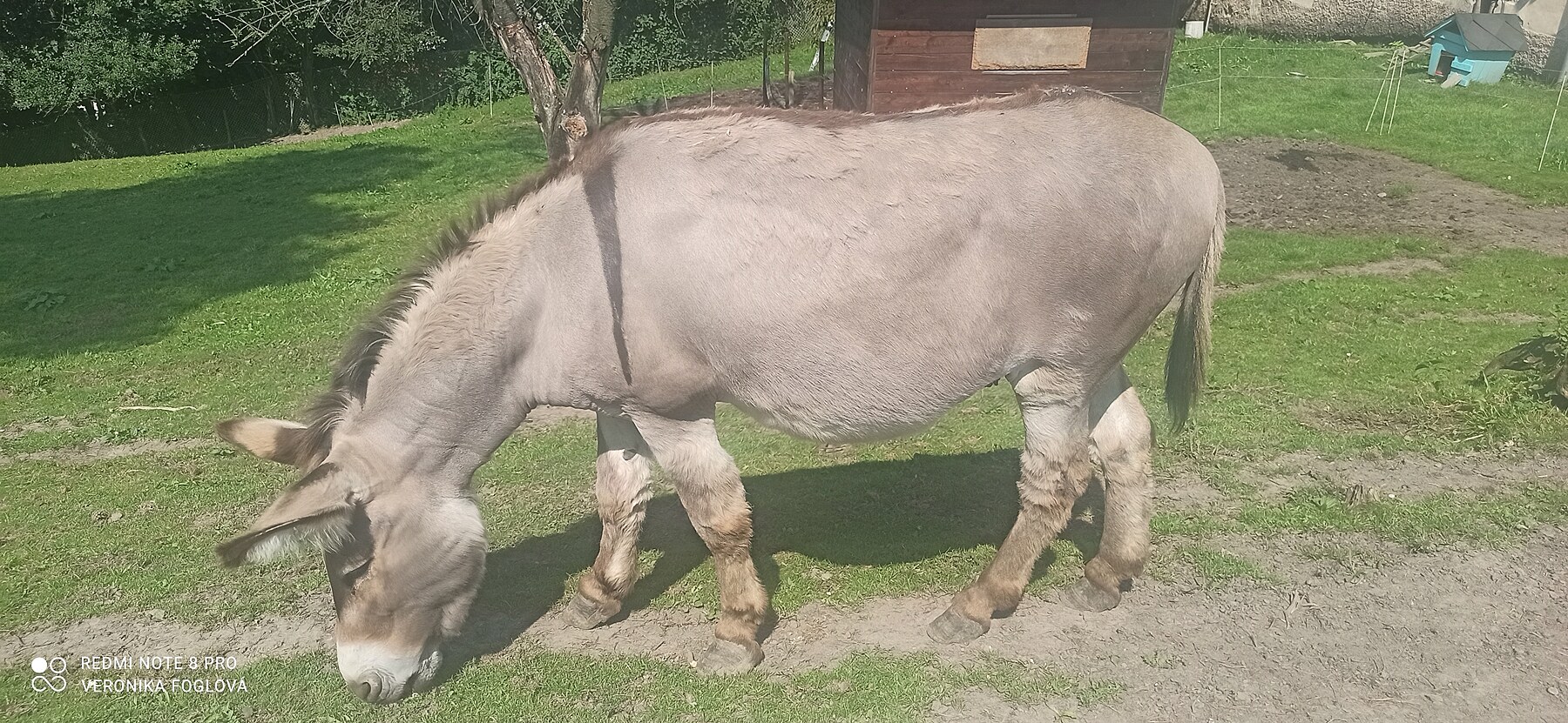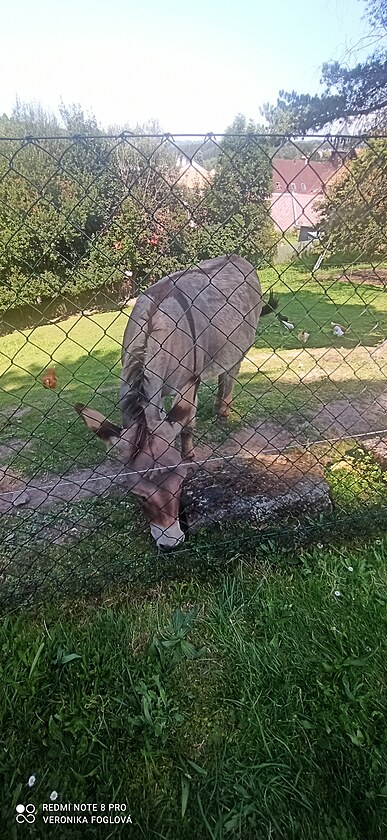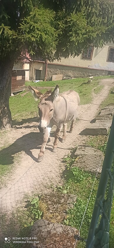 Jmenuje se Fredy a spolu s dalšími zvířátky bydlí na farní zahradě v Jablonném. Já jsem se s ním seznámila letos o prázdninách, kdy jsem ho poprvé navštívila...a on, jako by ve mně snad viděl spřízněnou duši, kvitoval můj příchod velice hlasitým hýkáním. V cuku letu zbaštil mrkvičky, které jsem mu přinesla, jinak popocházel po svém výběhu, o nějž se dělí s farními slepičkami, a sem tam uždiboval trávu. Byl velice přátelský a nechal se hladit, na což je ostatně nejspíš zvyklý hlavně od dětí, které tam přicházejí, neboť farní zahrada je volně přístupná.