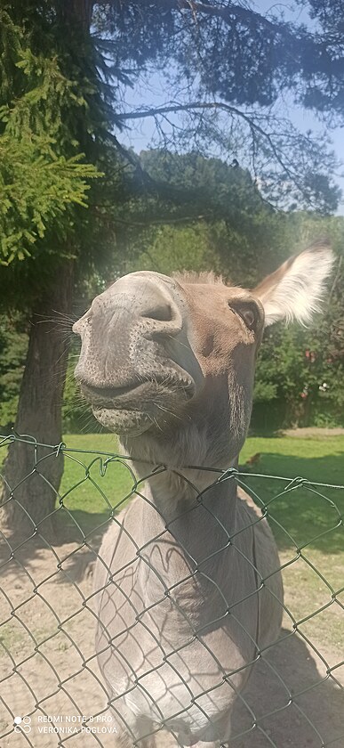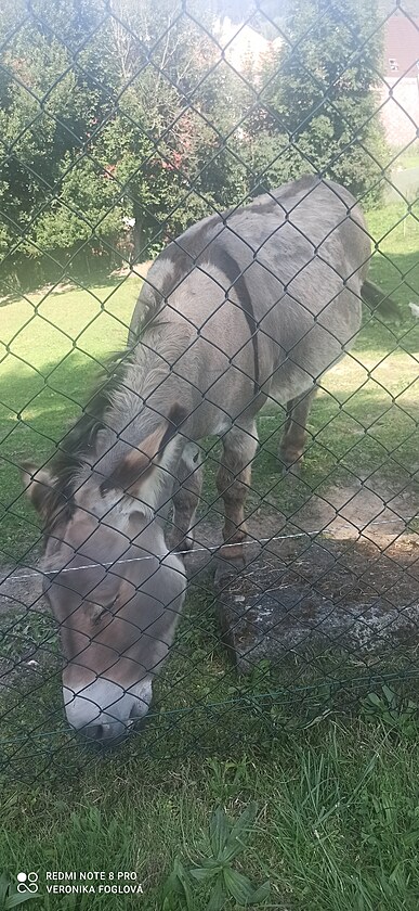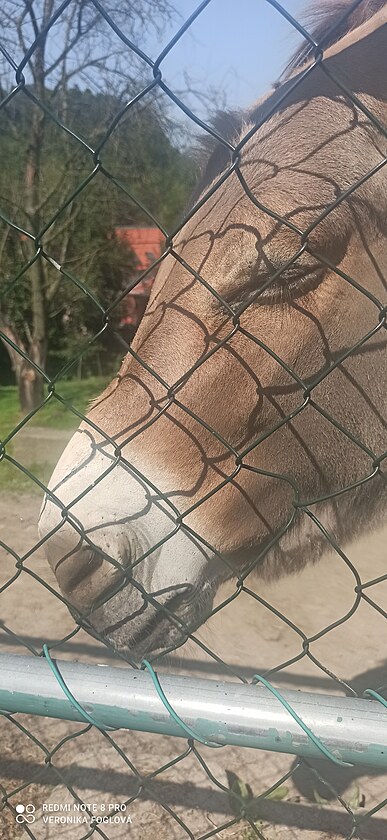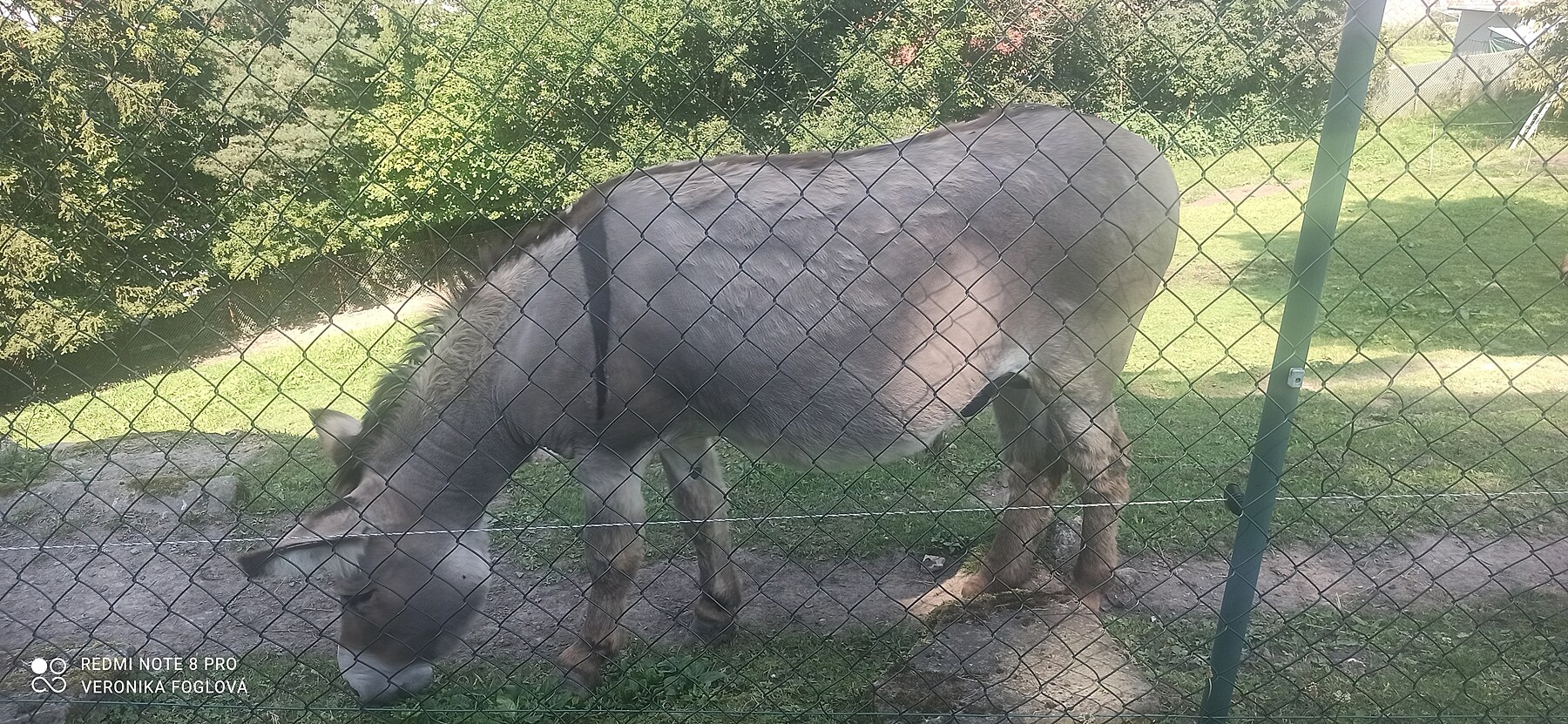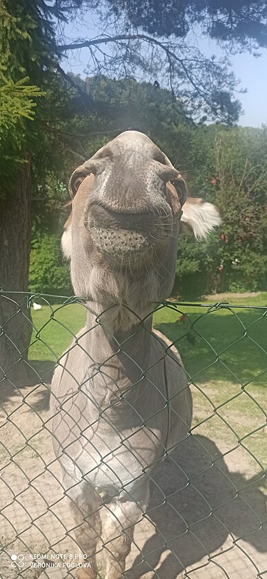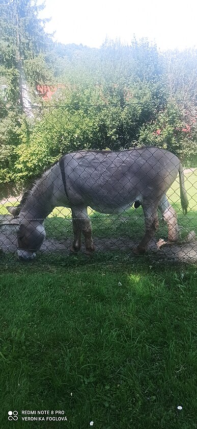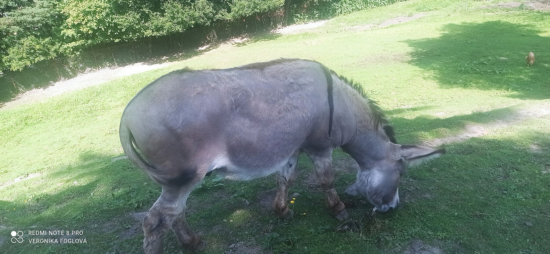 Jmenuje se Fredy a spolu s dalšími zvířátky bydlí na farní zahradě v Jablonném. Já jsem se s ním seznámila letos o prázdninách, kdy jsem ho poprvé navštívila...a on, jako by ve mně snad viděl spřízněnou duši, kvitoval můj příchod velice hlasitým hýkáním. V cuku letu zbaštil mrkvičky, které jsem mu přinesla, jinak popocházel po svém výběhu, o nějž se dělí s farními slepičkami, a sem tam uždiboval trávu. Byl velice přátelský a nechal se hladit, na což je ostatně nejspíš zvyklý hlavně od dětí, které tam přicházejí, neboť farní zahrada je volně přístupná.