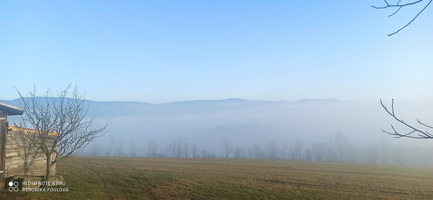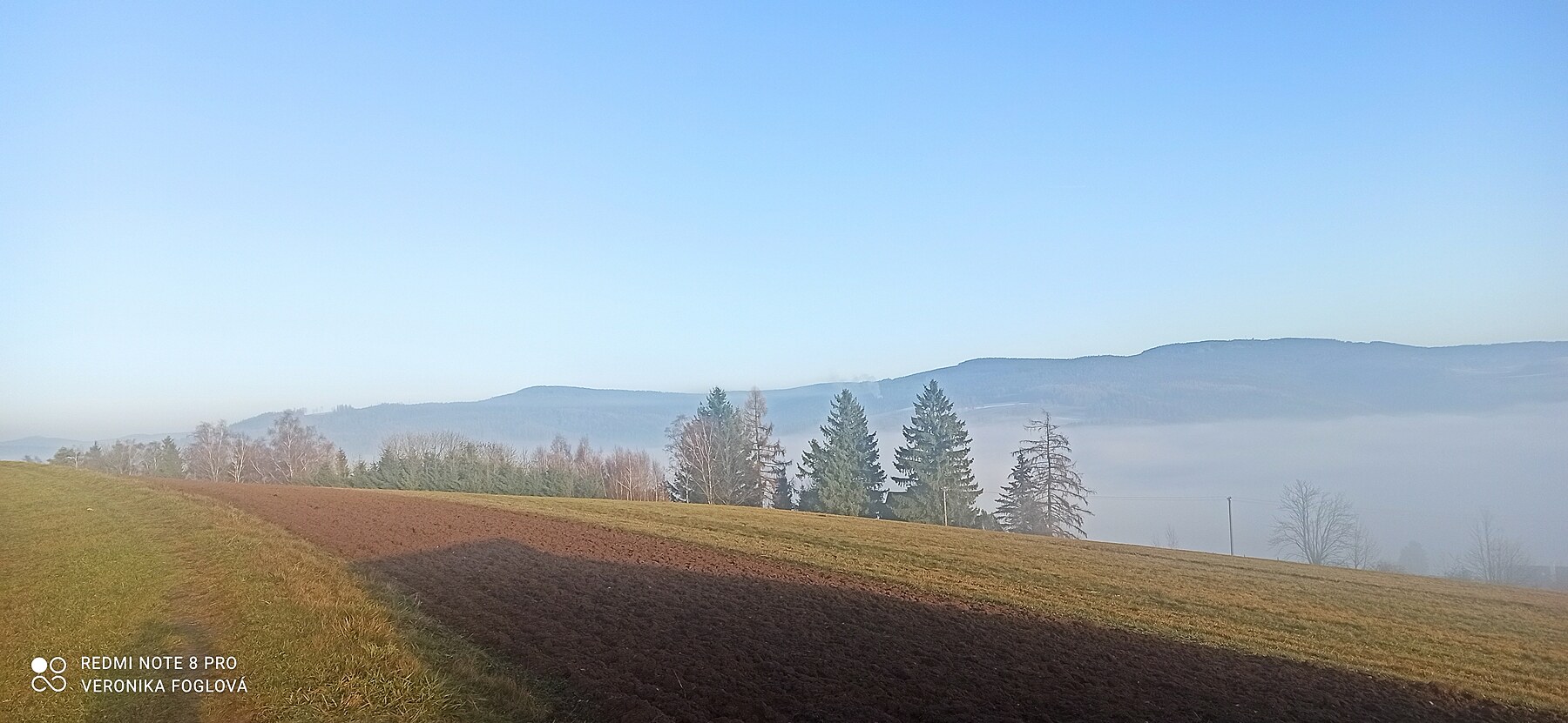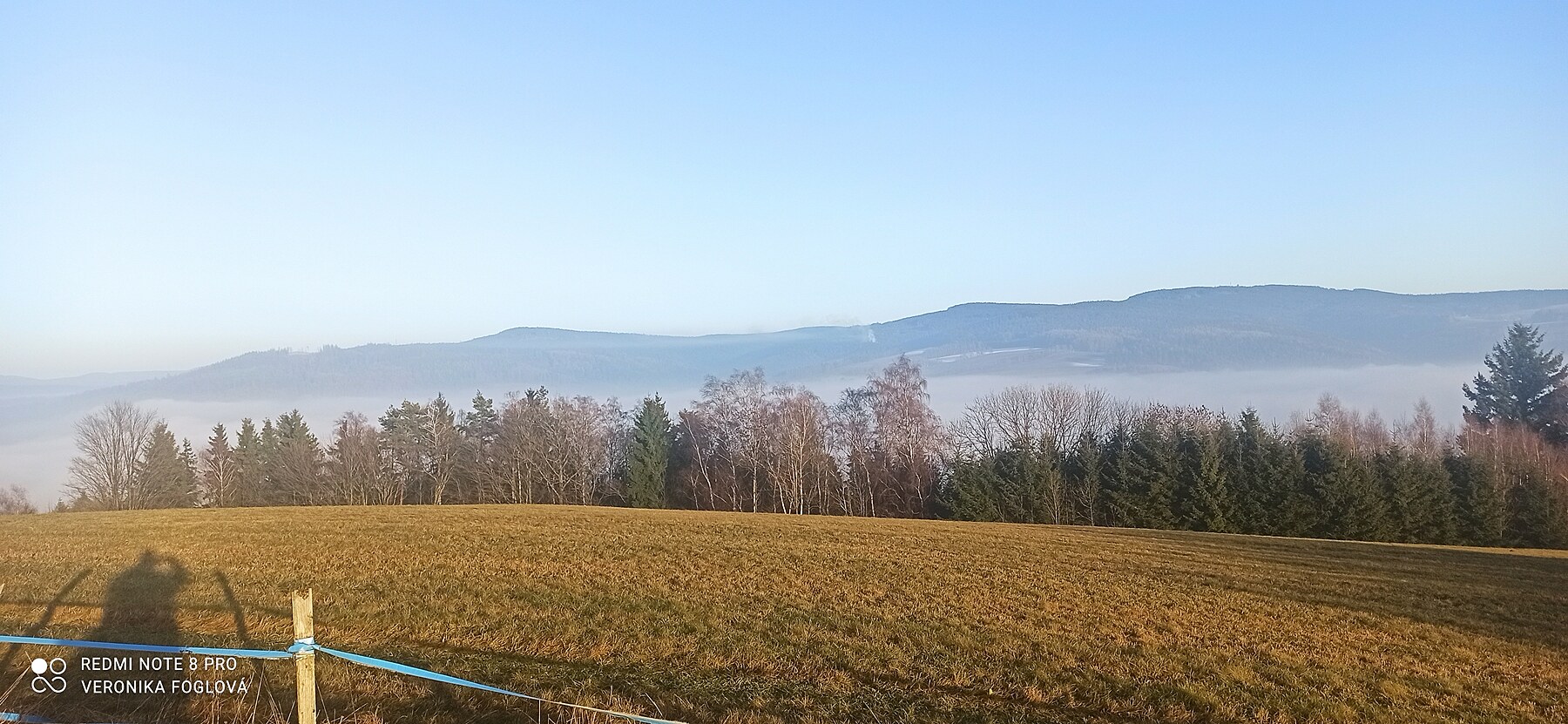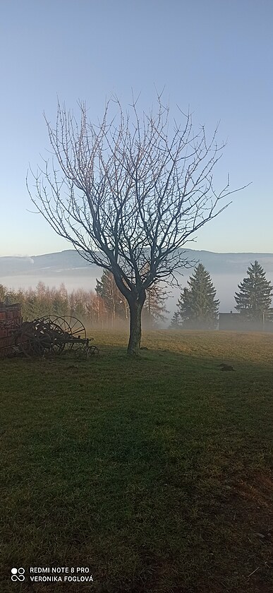 Bylo to kouzelné, vidět po těch dnech plných mlhy, mlhy a zase jenom mlhy modrou oblohu, okolní vrcholy, lesy, louky a pole. Fotila jsem kousek za naším domem...