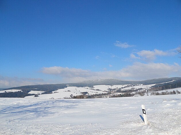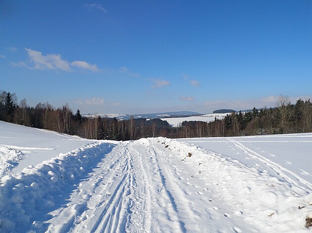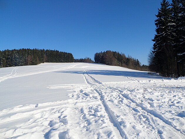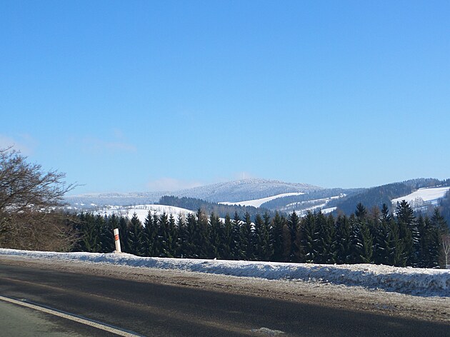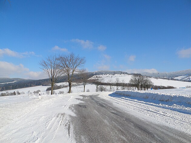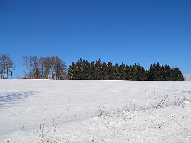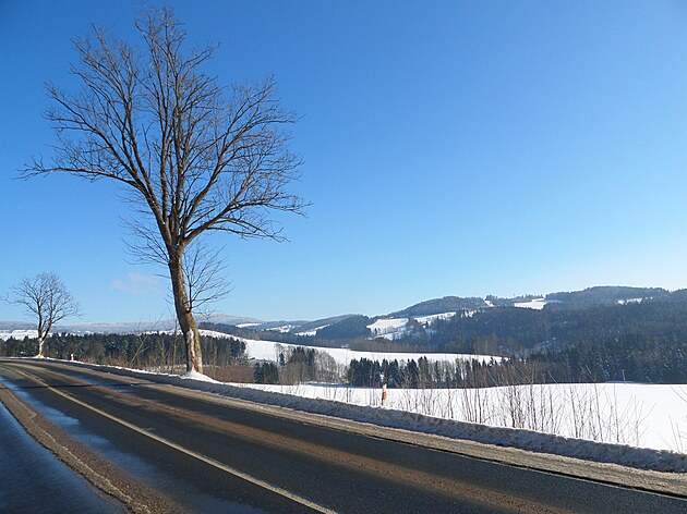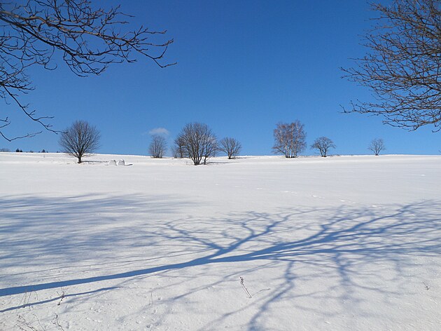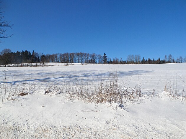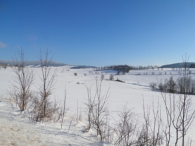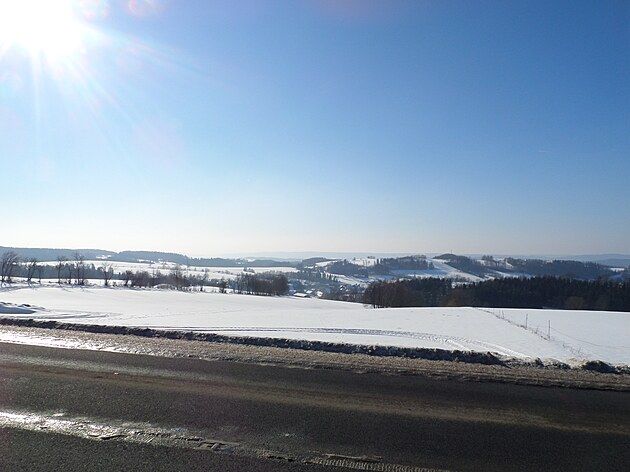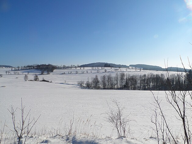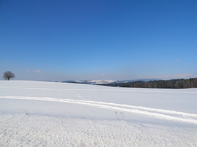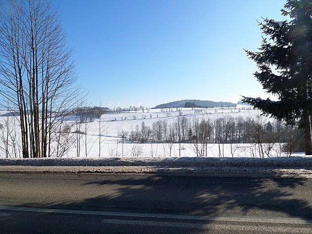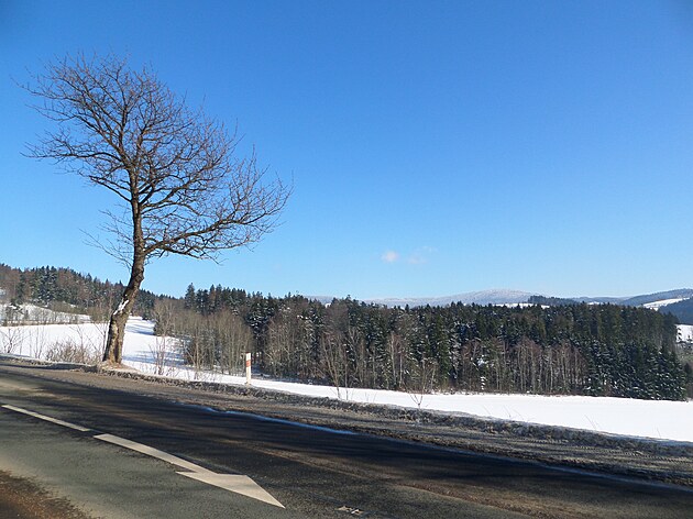 Za Bulíkem už se otevíraly zimní výhledy k Suchému vrchu (995 m) a Bukové hoře (958 m). V těchto místech je ale krajina otevřená na všechny strany a právě od Suchého vrchu foukal velmi mrazivý vítr. Postupovala jsem dál až na křižovatku Čenkovice – Orličky, odkud jsem se po osmi a půl kilometrech pěšky autobusem přesunula zpátky do Jablonného.