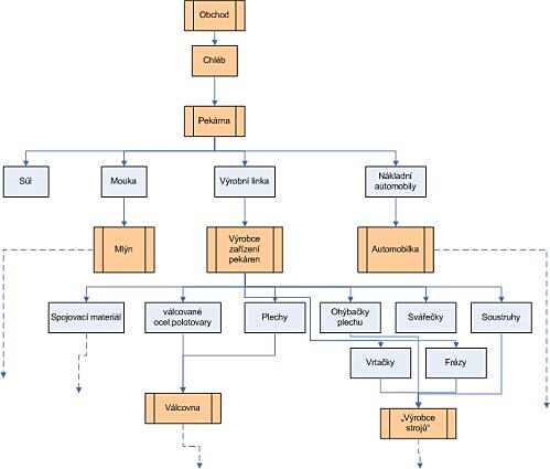 Dostali jsme se na konec? Ještě ne. Jedna potřeba/poptávka vyvolává další následné potřeba/poptávky. Jednoduchý příklad: Náklaďáky, které rozvážejí chleba, je potřeba někde vyrobit. Takové nákladní auto je docela komplexní věc. Potřebujeme například (pořadí zcela chaotické):