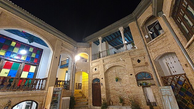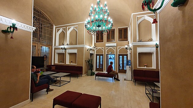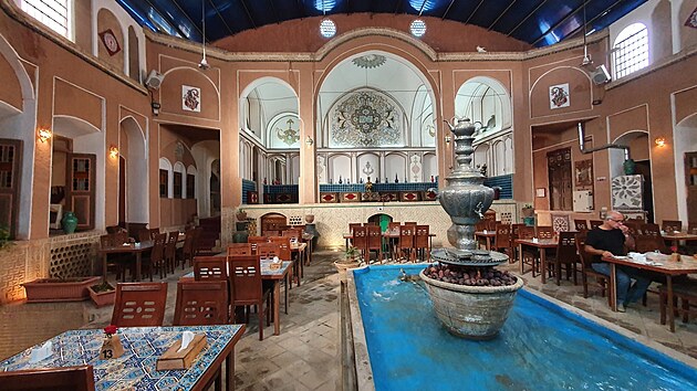 Ubytování v Kášánu jsme měli domluvené dopředu. Nějaký hotel potřebujete kvůli vízům, obvykle je to ten první. První noc jsme taky s jistotou věděli, kam chceme z letiště dojet. Kášán není zrovna mekka hotelů, ale je jich tam dost. Hotel jsme si zajistili přes server 1stQuest, který není ideální, Bookingu nesahá ani po paty, ale umí Írán. Za 36 euro máme hotel se špatným signálem, ale celkem pěkný, s hezkou jídelnou ve starobylém dvoře. Do Íránu jsme letěli přes noc, a po dalším dni na cestě jsme rádi, že máme kam složit hlavu.
