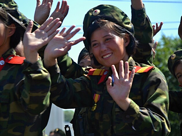 Najednou přichází signál. Odněkud a nějak. Asi telefonem. Z naší bezcílné procházky se stane bezmála úprk k autobusu. Někam se jede a nevíme kam. Že by nakonec soudruh Kim dal svolení k tomu, aby na Kim Ir-Senově náměstí, ke kterému jsme se dosud kvůli přípravám letos nesměli ani přiblížit), mohli vojenské přehlídce kromě místních papalášů a opravdových hostů přihlížet i turisté? Nevíme. Ale jedeme směrem do centra.