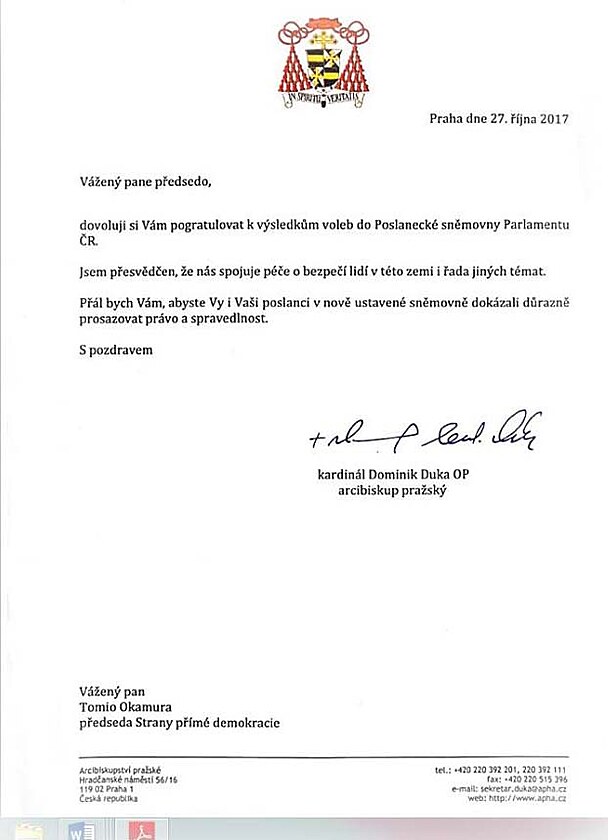 A Tomia Okamury si po jeho sdělení, že ho blahopřání otce kardinála velmi těší, vážím o to víc. Mám radost, že se objevil ve výkonné politice po dlouhé době po odchodu Václava Klause z Hradu politik, který říká: „Už dlouhodobě máme (s panem kardinálem) podobnou starost o budoucnost naší země, evropské civilizace a hodnot, které s sebou nese, jako jsou svoboda, demokracie, lidská práva a také naše křesťanské kořeny, včetně podpory tradiční rodiny.“