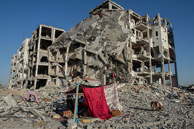 To je fotografie z Gazy na níž je rozestavěný dům, který je z půlky vybombardovaný a pod ním dole je stan ve kterém žijí lidé, kteří předtím bydleli v tom domě. A za tím stanem je člověk, který pije čaj. To ve mně evokuje jak smutek z té války, tak tu naději to překonat.
