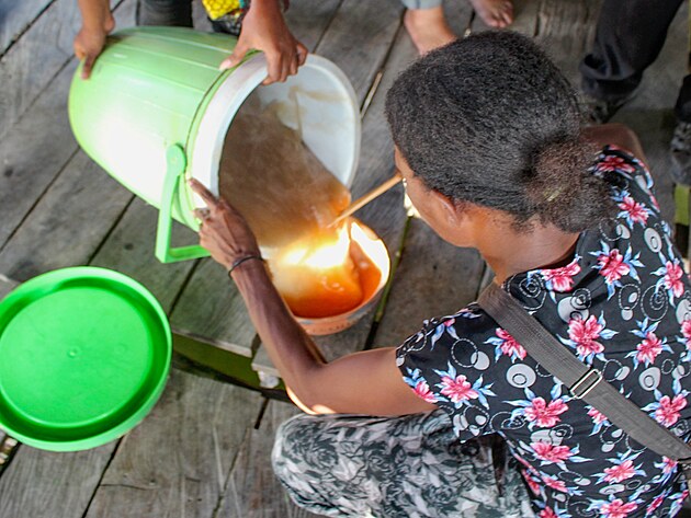 Vina mě zavedla do jedné z chatrčí nad vodou: „Vidíš, tohle je Papeda.“ Místní hospodyňka zrovna přelévala světlou lepkavou hmotu z kyblíku do připravené misky.