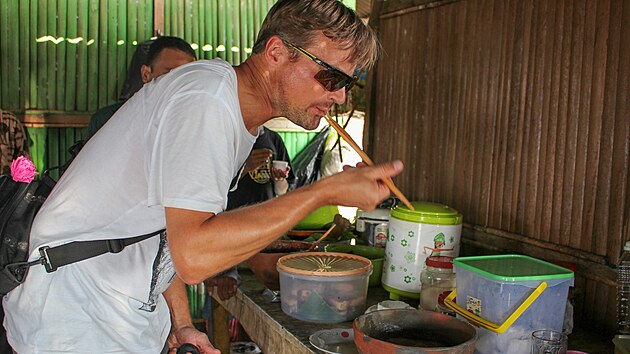 „Ochutnej“, pobídla mě Vina. Nedůvěřivě jsem se podíval do misky. Papeda připomínala dobře rozmíchané lepidlo na tapety. Z kyblíku se ještě kouřilo. Je to převařené, můžu to risknout. Uchopil jsem tradiční dřevěnou vidličku a několikrát s ní otočil v lepkavé hmotě. Nabral jsem sousto a opatrně jej vložil do úst. Potom ještě několikrát.
