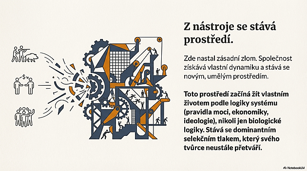 Zde nastal zásadní zlom. Společnost nepřetrvává pouze jako nástroj. Získává vlastní dynamiku, stává se novým, umělým prostředím. Toto prostředí začíná žít vlastním životem podle pravidel, která nejsou jen odvozena od biologické logiky, ale od logiky systému – pravidel moci, ekonomiky, ideologie. Z nástroje se stalo prostředí, které svého tvůrce neustále přetváří. Je tedy selekčním tlakem v tom nejužším smyslu slova.