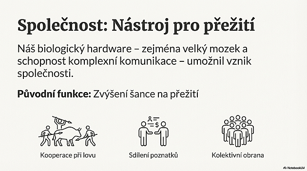 Tento biologický hardware– zejména velký mozek a schopnost komplexní komunikace – umožnil vznik společnosti. Zpočátku byl tento společenský útvar nástrojem, který zvýšil naši šanci na přežití (kooperace při lovu, sdílení poznatků, kolektivní obrana).