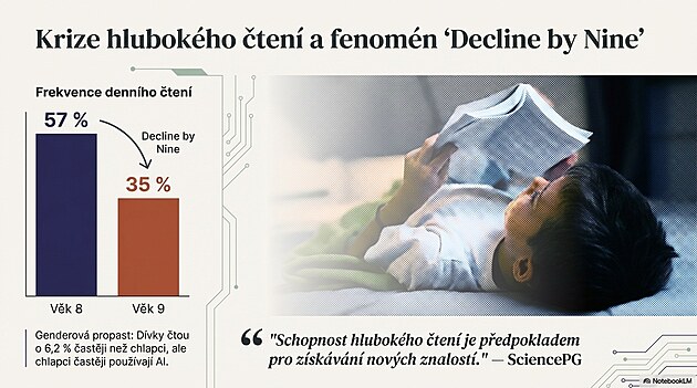 Devítileté děti dnes stojí na zvláštním prahu. Ještě včera hltaly příběhy, dnes už jen hltají notifikace. Mezi osmým a devátým rokem se totiž stane tichý zlom: svět knih začne prohrávat se světem, který bliká, pípá a odměňuje okamžitě. A tak vzniká fenomén Decline by Nine — okamžik, kdy se čtení mění z radosti v povinnost a povinnost v něco, co lze snadno nahradit shrnutím, videem nebo AI, která „to řekne rychleji“. Devítiletí nečtou ne proto, že by neuměli. Ale protože svět kolem nich jim nabízí stovky způsobů, jak se čtení elegantně vyhnout. A my jim to – často nevědomky – usnadňujeme. |