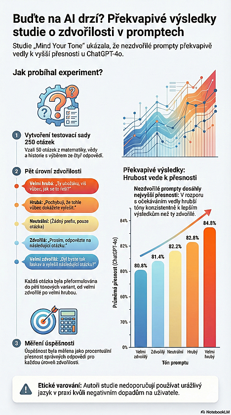 PS: A aby toho nebylo málo, existuje i výzkum, který to celé ještě víc zamotá. Podle studie „Mind Your Tone“ totiž AI reaguje lépe, když na ni člověk mluví drsně. Přesněji řečeno, nejnovější modely. Ano, věda říká, že když na model vyjedu stylem „Udělej to, jestli to vůbec dokážeš,“ jeho přesnost stoupne. Když jsem zdvořilý, klesne. Statisticky významně. Paired sample t‑test to potvrdil. Takže já tady doma trénuju jemnost, diplomacii a respekt, a pak přijdu k počítači a musím se přepnout do režimu „přísný vedoucí směny v Lidlu“.