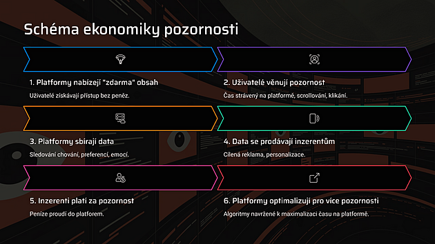 Definice: Ekonomie pozornosti je odvětví ekonomie, které zkoumá, jak se pozornost lidí stává komoditou. V prostředí, kde je nabídka informací prakticky neomezená, je vzácným zdrojem právě lidská schopnost soustředit se. Princip: Produkty a služby (zejména digitální obsah) jsou často dostupné zdarma nebo za nízkou cenu. Hodnota se proto přesouvá k tomu, kdo dokáže získat a udržet pozornost uživatele. Anglický termín: Attention economy – hojně používaný v akademických i praktických diskusích o médiích, reklamě a digitálních platformách. |