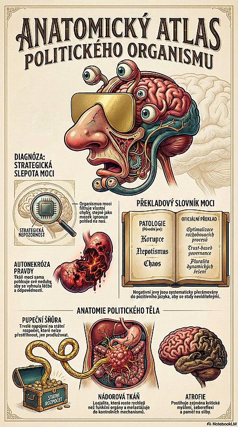 Pupeční šňůra: propojení s rozpočtem; nelze přestřihnout, pouze prodlužovat a násobně štěpit. V pokročilých stádiích se stáčí kolem krku daňového poplatníka. Slepé střevo: orgán, o němž se ví, že je zbytečný, ale odstranit ho znamená riziko infekce celého systému. Koaliční partner, například. Nádorová tkáň: loajalita, která roste rychleji než funkční orgány a metastázuje do kontrolních mechanizmů. Imunitní systém: média a justice, pokud jsou paralyzovány chronickou alergií na moc nebo dlouhodobou expozicí telefonátům z vyšších míst. Syndrom amputované končetiny: pocit, že stále vlastníte principy, které vám byly amputovány před lety. Velmi běžný u dlouhodobě sloužících politiků. Parasympatický nervový systém: část autonomního systému odpovědná za klid a odpočinek. V politickém organismu kompletně nefunkční; nahrazen hyperreaktivním PR aparátem. Atrofie: proces, kterým svalstvo zaniká nepoužíváním. V politice postihuje zejména kritické myšlení, sebereflexní schopnosti a paměť na sliby. Plazma: tekutina nesoucí živiny. V politickém těle se skládá z médií poslušných, dotací kreativně rozdělených a statistik kreativně interpretovaných. Homeostáza: schopnost udržovat vnitřní rovnováhu. V politice dosažena tím, že se všechny indikátory upraví tak, aby ukazovaly rovnováhu. Gangrena: odumírání tkáně způsobené nedostatečným prokrvením. Typicky postihuje vzdálené regiony, kam centrální moc nedodává zdroje, ale stále z nich čerpá daně. Kóma: stav hlubokého bezvědomí. Volič po opakované páté lži Neuronová síť (nově přidaný orgán): adaptivní filtr reality, který místo aby zvyšoval ostrost vidění, optimalizuje slepotu. V politickém organismu funguje jako digitální rohovka, která propouští jen to světlo, jež lichotí moci. AI se učí z dat, která jí systém předloží tedy z vlastních slepých míst. Výsledkem je algoritmická verze téhož triku: špička nosu zmizí ještě dřív, než by ji mozek stihl ignorovat. V biologii by se tomu říkalo percepční adaptace. V politice „modernizace komunikace“. V praxi jde o outsourcing sebeklamu do cloudu. |