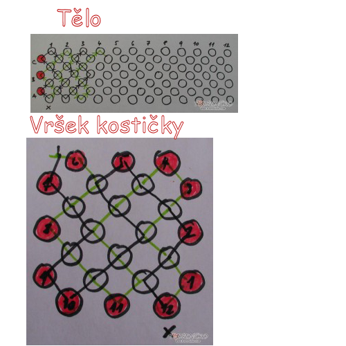A teď ten návod. Je na kostičku jako je na obrázku. Vlasce potřebujete cca metr a korálků cca 132. A pro upřesnění - červené korálky vlevo se už spojují s 12. sloupečkem a červené korálky na spodním obrázku označují korálky z horního obrázku, u kterých je číslo. Když kostičce děláme spodek a vršek je to spíš takové vyplétání.