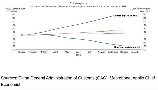 Na LinkedIn se k tomu objevují hezké grafy. Jeden z nich ukazuje, jak se vyvíjely čínské exporty v roce 2025: