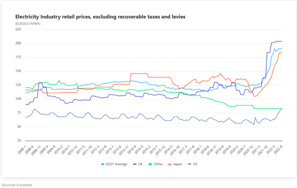 Následující graf sleduje ceny průmyslové elektřiny v čase. V EU křivka dlouhodobě sedí nahoře – a po roce 2021 letí ještě výš.