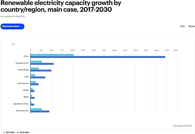 Poslední graf ukazuje růst výrobní kapacity energie z obnovitelných zdrojů (soláry, baterie, atd.) podle regionů: