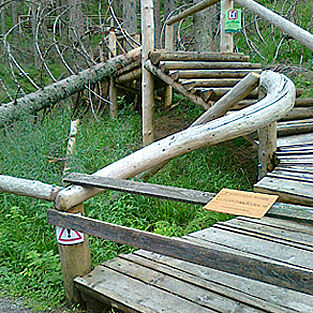 To skutečné místo leží asi 200 metrů stranou a o něco výš. Před časem bylo vyčištěno, upraveno a kolem rostoucí dřeviny dostaly i jmenovky. A hlavně byla vybudována od hlavní cesty nahoru krásná dřevěná lávka se vším zajímavým povídáním. Ale na tu lávku se nesmí. A to člověku hlava nebere.