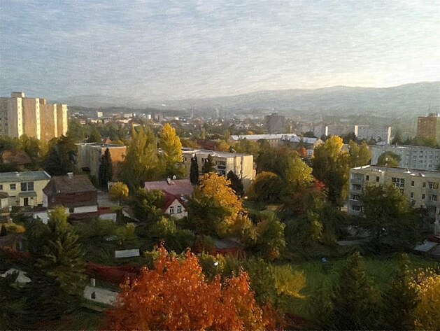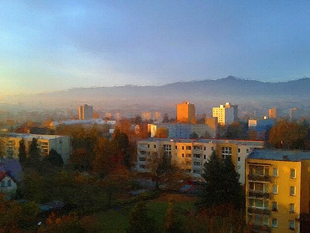 Foto - večerní výhled z okna za mlžného počasí. Mobilní foťák nedostatek světla nezvládá, ale to pro úpravu vůbec nevadí spíše naopak.