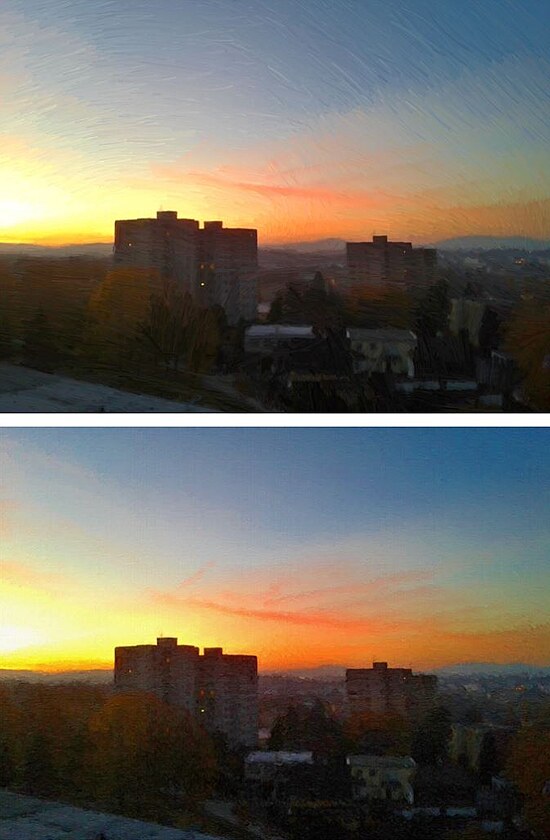 2. olej . slabý štětec - zvlněné tahy - připomíná techniku impresionistů (Renoir, Monet). Sílu zvlnění si rovněž můžete nastavit (a lá Vincent van Gogh)