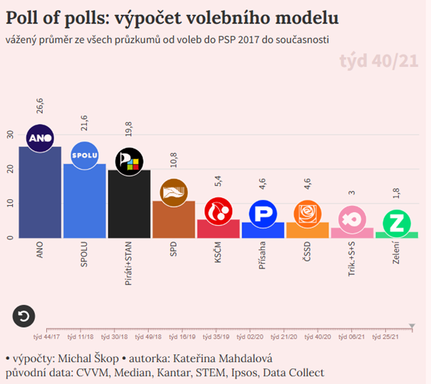 Volby do Sněmovny by v září 2021 (poznámka autora) vyhrálo vládní hnutí ANO se ziskem 24,5 procenta hlasů, těsně za ním by s 23 procenty skončila koalice Spolu (ODS, TOP 09 a KDU-ČSL). Třetí by byla koalice Pirátů a STAN, kterou by volilo 20,5 procenta Čechů. Vyplynulo to z volebního modelu agentury Kantar CZ pro ČT.