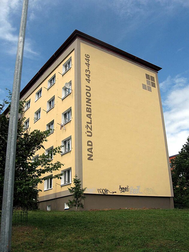 Nemusíte hledat cedulku s číslem popisným, která je viditelná, až když stojíte před vchodem. Již z dálky vidíte, že támhleten dům je "Nad Úžlabinou 443-446".