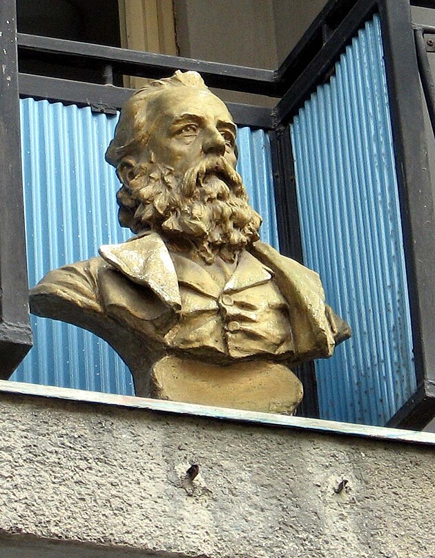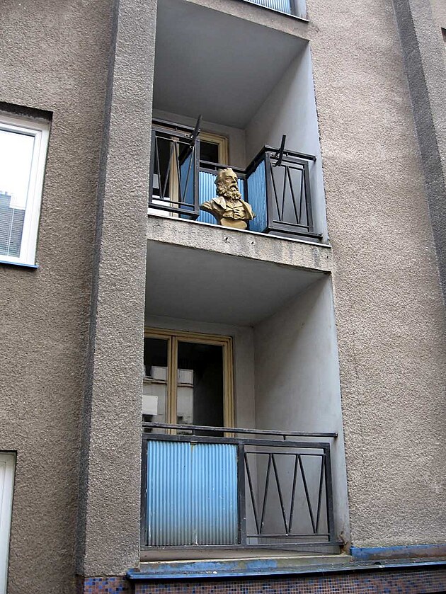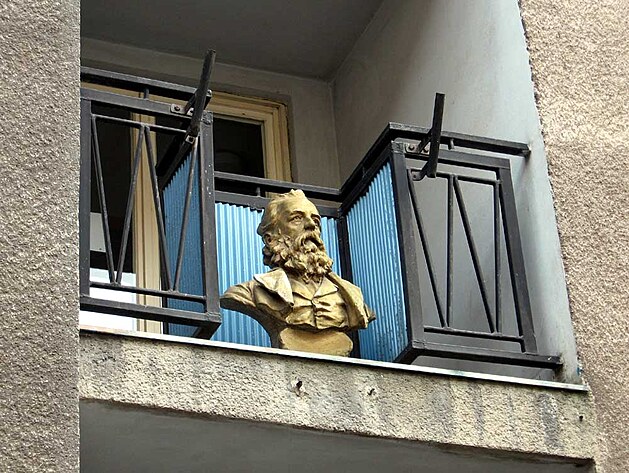 Tento seriózní fousáč se dívá z výšky do protějších domů a z obou stran mu zřejmě ve významných dnech třepetaly dvě vlajky. Jistě tušíte kterých států. Že by Marx?! Ač jsem zažil pár měsíců marxismu-leninismu, přesto nejsem v těchto věcech zas až tak zběhlý - je to opravdu onen velký Karel!?
