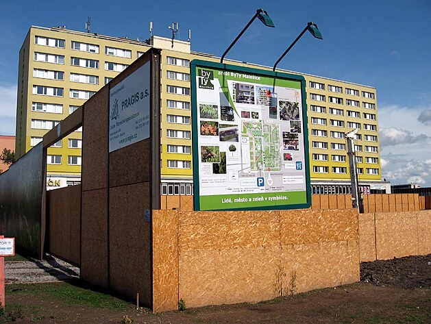 Má tam vyrůst supermarket, cukrárna, kavárna, podzemní garáže a 290 bytů - v 1. etapě. Na zelené informačním tabuli je dole krásné heslo "Lidé, město a zeleň v symbióze." Všude kytičky, zeleň a to i na www.bytymalesice.cz. Že by v Malešicích vyrůstal ztracený ráj?