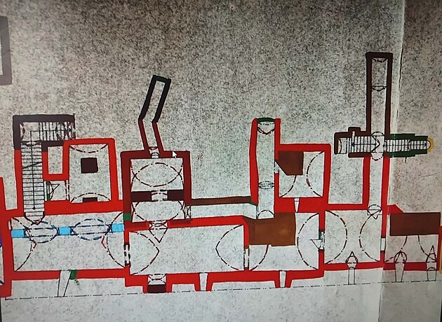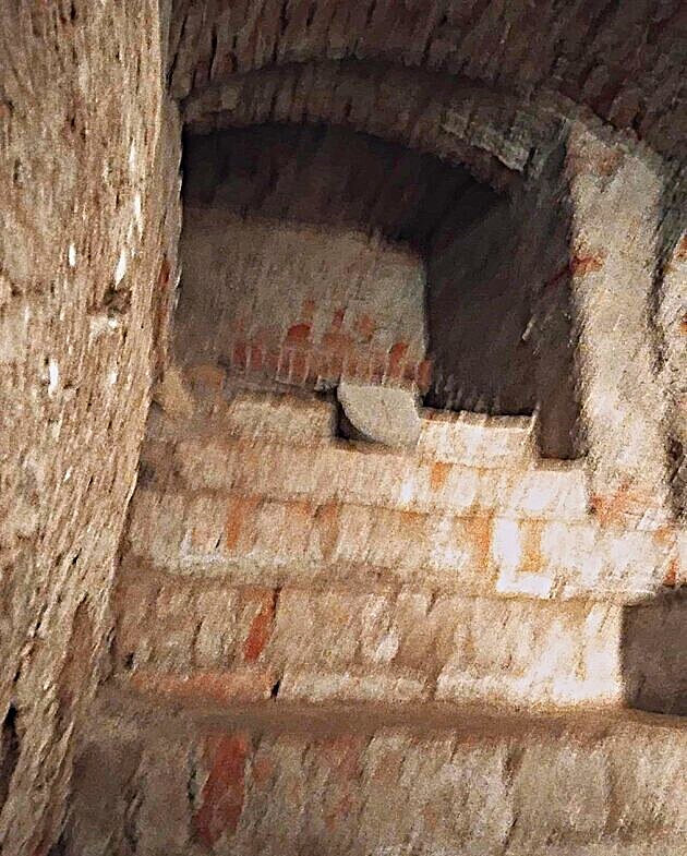 Je tu dobre vidieť, ako sa kedysi stavali pivnice. Tu je zachovaná malta minimálne z 13. až 14. storočia. A, aha, pozostatky dreveného debnenia, šalungu. Je to už pekne zvetrané, ale môžete vidieť to vrstvenie, ako sa to vyvíjalo počas stáročí.