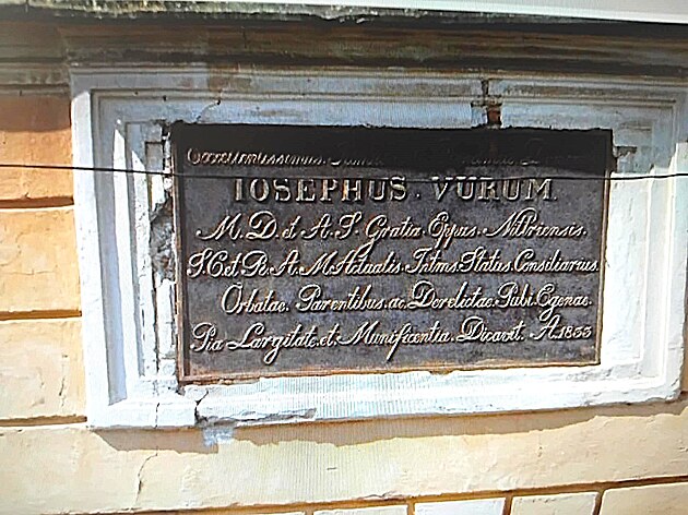 O vytvorení sirotinca nás informuje tabuľa, ktorej text znie: „Najvznešenejší, najjasnejší ako aj najdôstojnejší pán Jozef Vurum, z vôle všemohúceho Pána a Apoštolského stolca nitriansky biskup, v otázkach vnútroštátnych dôverný poradca cisársko-kráľovského Majestátu Rakúsko-Uhorska, úbohým sirotám a rodičmi odvrhnutým deťom tento útulok vo svojej milostivej štedrosti a dobročinnosti láskavo roku 1833 odovzdal.“