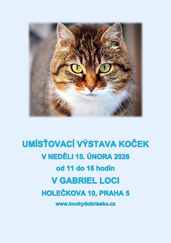 Tak tedy k věci, poslyšte, dvounožci, ta výstava se bude konat už následující neděli, a protože nemáte tak dobré oči jako my kočky a nemuseli byste to rozluštit, tak vám to tady naškrábu drápkem: 15. února od 11 do 16 hodin v bývalém klášteře Gabriel Loci, Holečkova 10, Praha 5, Smíchov. Hezky si to zapište za uši, abych vám to tam nemusela vlastnotlapkově naškrábat já.