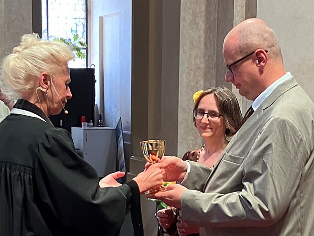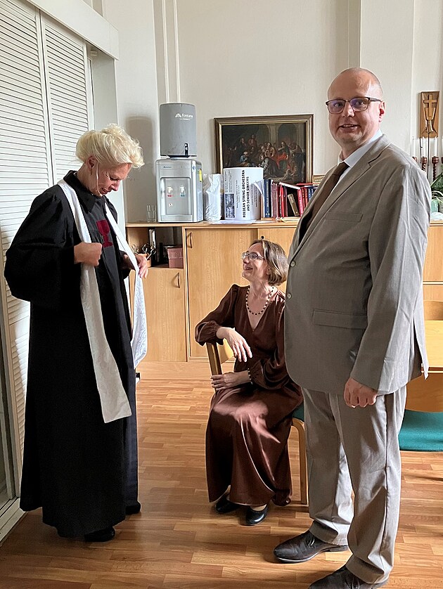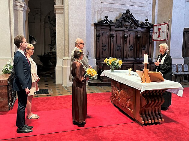 Včetně zákulisí, v němž paní farářka církve Československé husitské poskytuje snoubencům poslední pomaz... vlastně, promiňte, udílí jim poslední rady před obřadem.