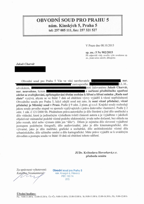Po konzultaci s právníky se škola rozhodla dokument svého absolventa a žáka, režiséra Jakuba Charváta "Rada nad zlato" soutěžně nevysílat v rámci programu Mezinárodního festivalu studentských filmů 2015 a to vůbec. Vedení tvůrcům sdělilo, že nemůže riskovat případné neblahé dopady na jméno a pověst školy a finančně zruinovat školu v případném soudnim sporu s firmou, jejíž praktiky tento dokument ukazuje. To, že se nejedná o hloupý žert, ale o naprosto podložená fakta, snad dostatečně dokazuje přiložená kopie úředního dokumentu, který nabádá soud vydat předběžné opatření o dalším šíření, promítání snímku a poskytování třetím stranám. Už cílení žaloby poněkud pokulhává, jelikož majitelem práv na tento studentský snímek není jeho autor a režisér, ale samotná škola, která byla a je garantem této studentské práce, a on a jako takový s nimi nemůže sám svévolně nakládat.
