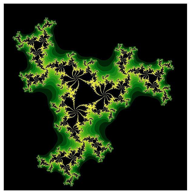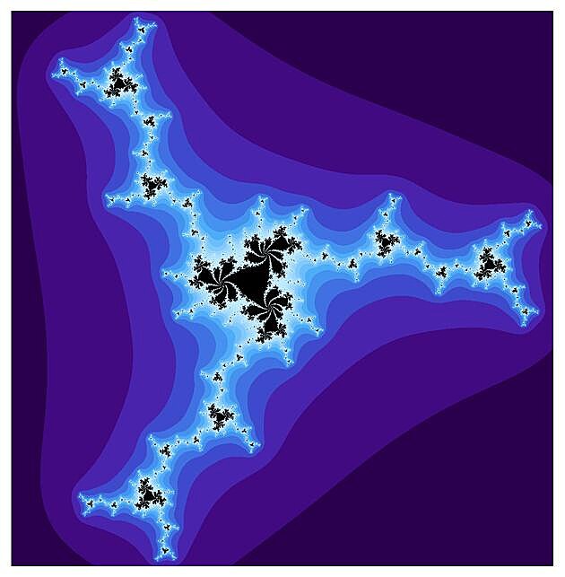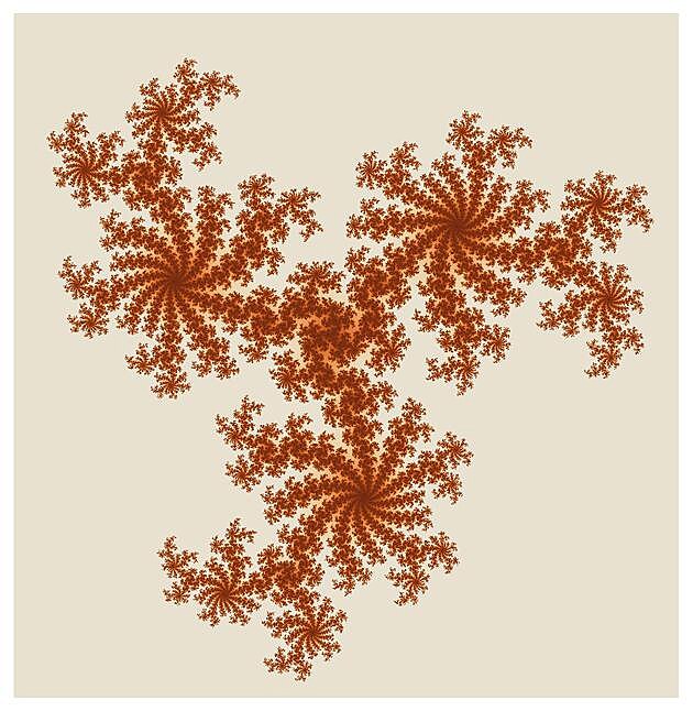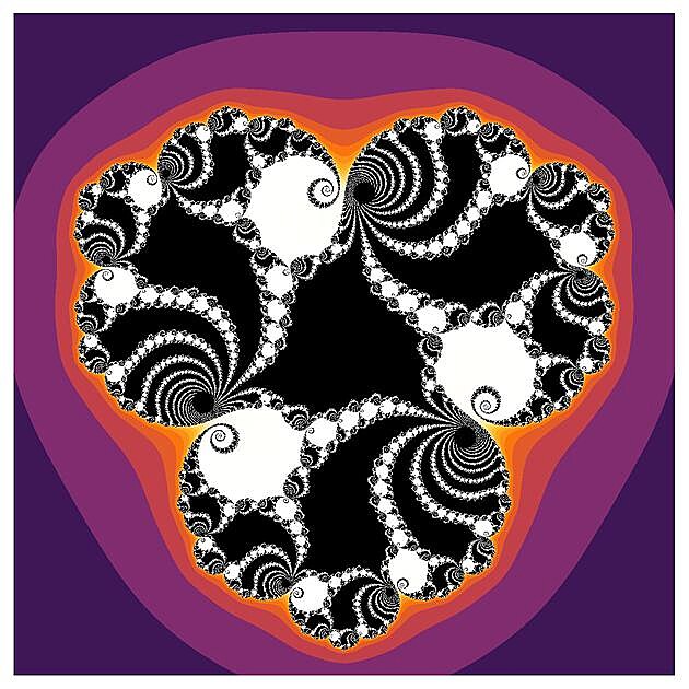 Všechny obrázky Juliových množin níže vznikly iterací kubické funkce f(z)=z3+s, pro nějaké pevně zvolené komplexní číslo s. To mimochodem znamená, že všechna ta krása a mnohovrstevnost každého obrázku je plně zakódována v jednom jediném komplexním čísle s. Začneme s hodnotami s uprostřed Mandelbrotovy množiny, kde je ta černá, stabilní část poměrně robustní.