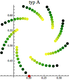 Na obrázku vpravo jsem si vzal posunutou kubickou funkci f(z)=z3+s (kde s je pevně zvolený komplexní parametr) a sestrojil orbitu odpovídající počáteční hodnotě z0 = 0.2+0.4i (červený bod). Abychom lépe viděli dynamiku této orbity, měním s průběhem času barvu od tmavě zelené po žlutou (v daném případě se orbita spirálovitě propadá dovnitř, skáče z jedné větve "galaxie" na druhou, ale při tom zůstává v naznačených mezích, takže se jedná o typ A).