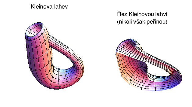 Takže ve 4D je Kleinova láhev zcela legitimní 2D varietou bez "samoprůniku" (ten vzniká teprve projekcí zpět do 3D - stejně jako když mimoúrovňovou autodráhu promítnete do 2D podlahy a získáte křížící se "osmičku").