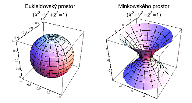 Předminule jsme si řekli, že norma (a s ní související skalární součin) určuje geometrii prostoru. Jakákoliv změna v definici se tudíž citelně projeví na jejích vlastnostech (i pouhé prohození znaménka dokáže při výpočtu natropit pěknou paseku). Mohli bychom si sice vymyslet imaginární čas it, který by to dal Eukleidovsky do cajku - protože i2=-1, takže z (2) by se stalo (1) - ale takové formální světočarování mi přijde trochu zavádějící.